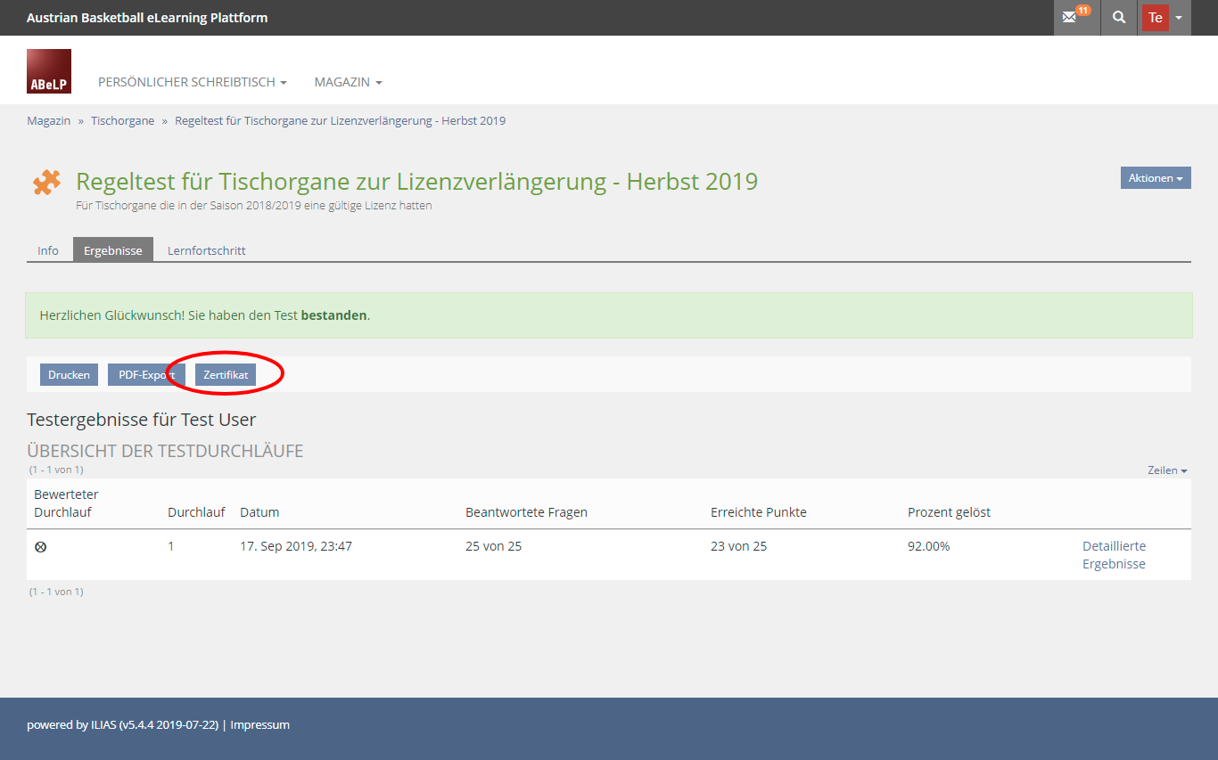 Unter dem Reiter "Ergebnisse" wird dir der Button "Zertifikat" angezeigt.